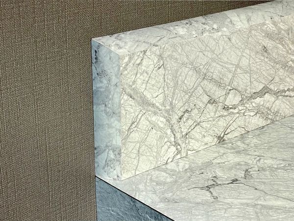 Strong, crisp angles enhance the solid stone look with a classic look and feel. The 45 degree angle "cut" reflects light for a defined border that smartly frames your countertop.